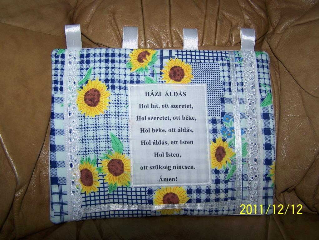 Ez a házi áldás "megrendelésre" készült. Nem szeretek én így varrni, hogy pénzt "kinálnak" érte. Nem tökéletes korántsem a varromyányom és nem akarok vele csalódást okozni. Ezért varrtam még egy textil tárolót is mellé....Andinak egy kérése volt, hogy a mamája szereti a napraforgót...ezért hajtottam fel ezt az anyagot neki hozzá.:-)))